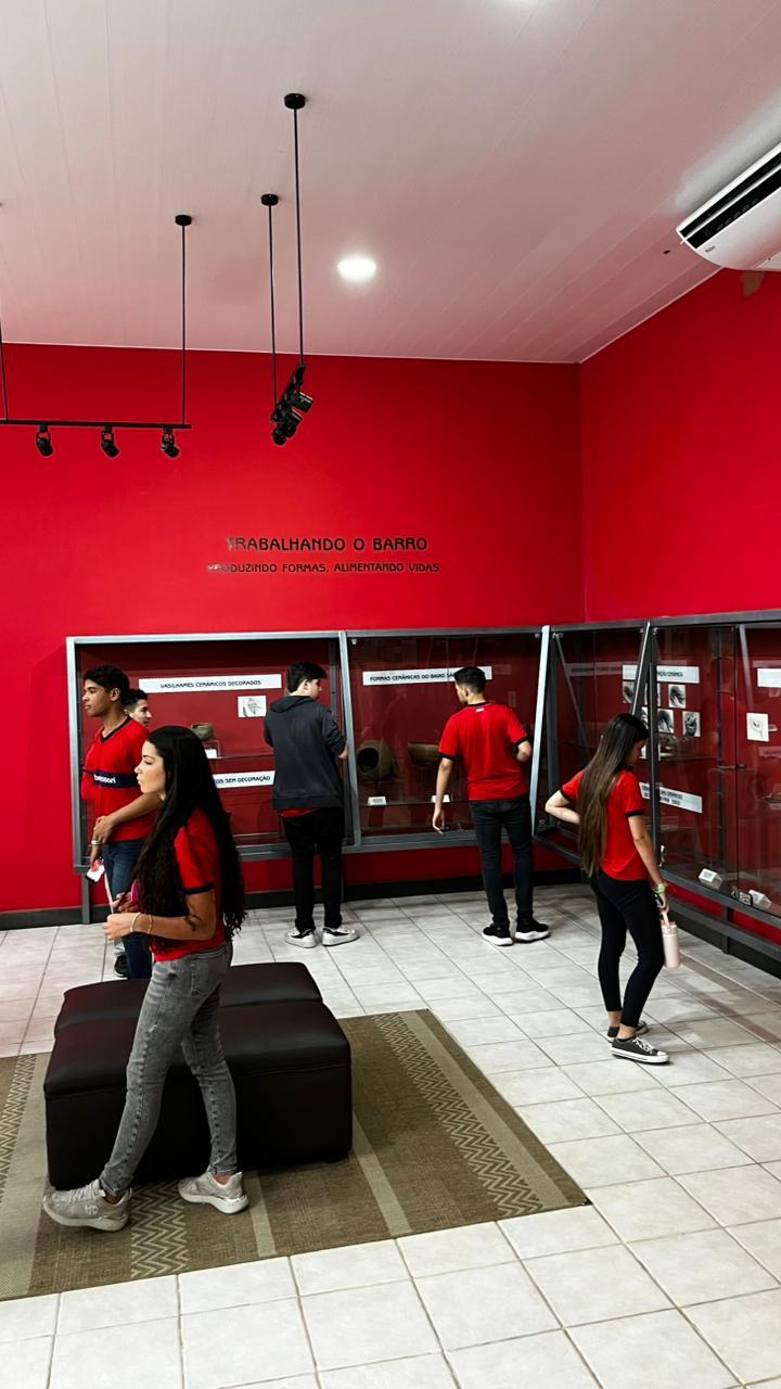 Durante a visita, os alunos puderam observar peças originais, réplicas e maquetes que retratam o modo de vida dos povos pré-históricos da região — suas ferramentas, utensílios, cerâmicas e hábitos culturais.